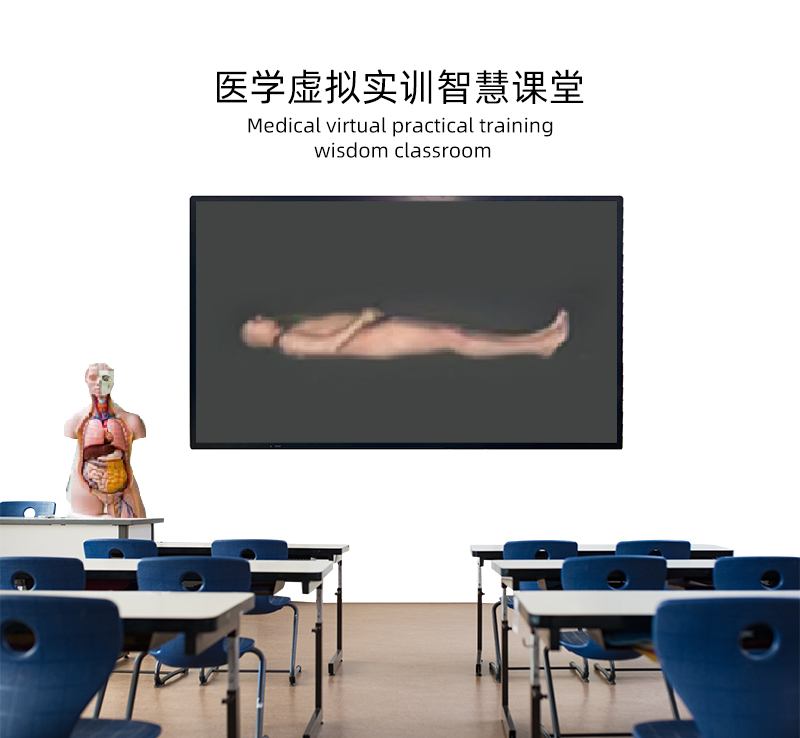 醫學虛拟實訓智慧課堂采用零貼合技術和電容觸控技術,4K 高清顯示屏,搭載數字化三維技術,虛拟人體結構解剖系統。觸屏交互操作,觸控操作可實現不同方位和層次人體結構的任意角度剖切、觀察。将人體解剖學、局部解剖學、斷層解剖學的知識融合起來 ,幫助醫學教育建立三維空間,實現互動體驗醫學教學。
