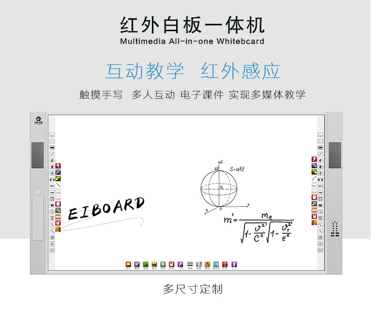 紅外白闆一體機集電腦、音箱、展台、智能中控、白闆于一體,采用一體化無縫拼接設計美觀大氣,電控展台方便收納,紅外二十點觸控滿足多人同時書寫,闆面采用冷軋面闆防撞防刮,尺寸擴展性強,滿足不同教學場景需求。