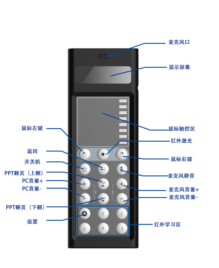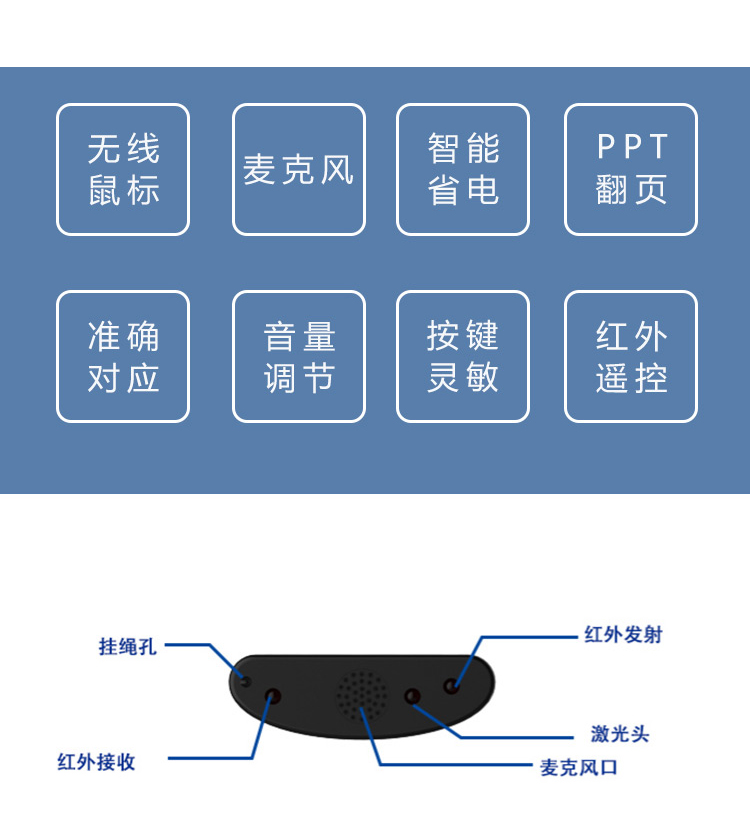 自主研發集遙控器、鼠标、麥克風、翻頁器、激光筆于一體,支持課件翻頁、課堂擴音等課堂操作功能,産品自帶锂電池,續航時間長達8小時,紅外傳輸距離可達20米。