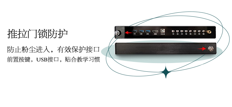 機身保護——獨特的推拉門鎖設計,保護前置按鍵及接口,還能收納白闆筆和教鞭;