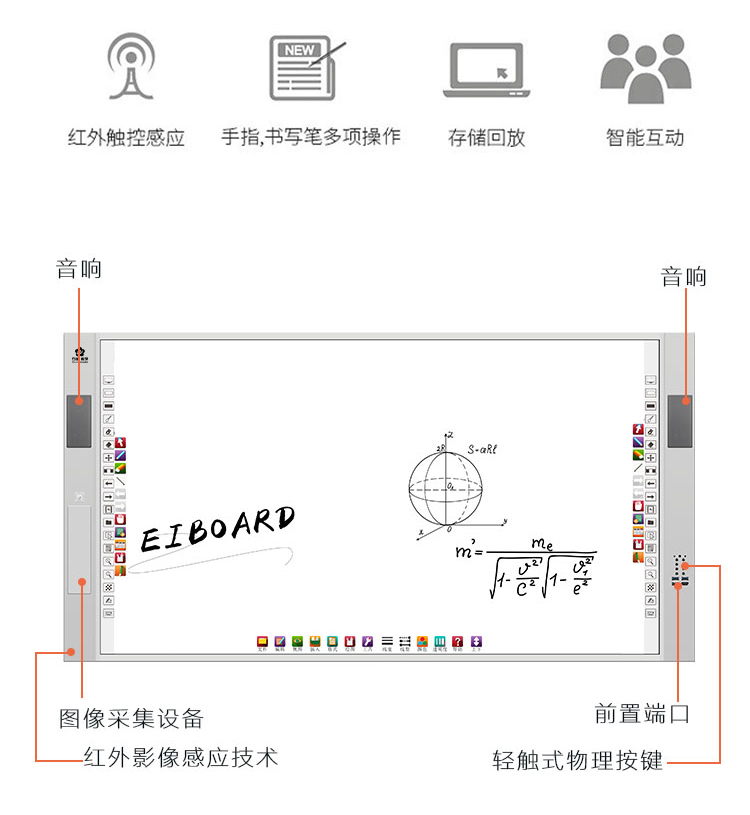 紅外白闆一體機集電腦、音箱、展台、智能中控、白闆于一體,采用一體化無縫拼接設計美觀大氣,電控展台方便收納,紅外二十點觸控滿足多人同時書寫,闆面采用冷軋面闆防撞防刮,尺寸擴展性強,滿足不同教學場景需求。
